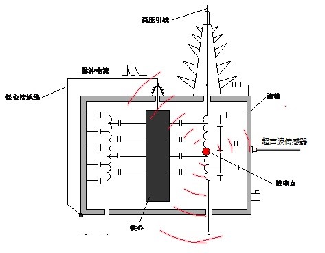当变压器内部产生放电信号时,除产生放电脉冲电流沿容性回路传输外,还会同时激发出机械波(超声波)信号通过变压器油向四周辐射传播。虽然电力变压器的结构较为复杂,但是变压器的整个器身内充满了变压器油,而绕组、绝缘材料、支撑、夹件、引线等部件均浸在油中,由于变压器油为超声波的良好传播媒介,这为在箱壁外侧检测局放产生的超声信号提供了有力条件。所以,在变压器的箱壁外侧安放超声波传感器可以接收到内部较大的放电信号。