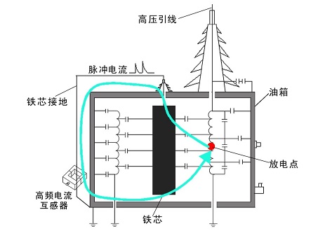 由电力变压器的结构所决定,其绕组除匝间电容外还与铁心之间存在几百甚至几千p F的分布电容,同时绕组与油箱间也存在上百p F的分布电容。当变压器的绕组等主绝缘回路中发生局部放电时,其产生的高频信号覆盖了从几十千赫兹到几十兆赫兹,甚至到千兆赫兹,由于几百皮法电容对于几百千赫兹以上的高频信号相当于通路,所以放电信号就会向所有与放电点有容性关系的回路中传播,其中一条回路必然包括铁心接地回路。所以在铁心接地线上安装高频电流传感器可有效接收变压器内放电信号。